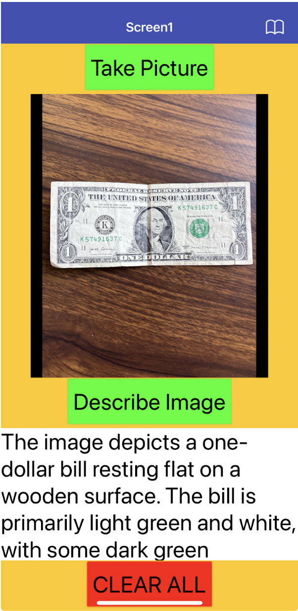 The GenAI Vision Aid App is a computational action application accessibility tool that helps visually impaired users understand their surroundings. It allows users to take a photo with their device and then uses an AI model to generate a detailed, spoken and written description of the image’s contents. This enables users to better understand their surroundings, read text, recognize objects, and identify people or scenes through natural language descriptions.
